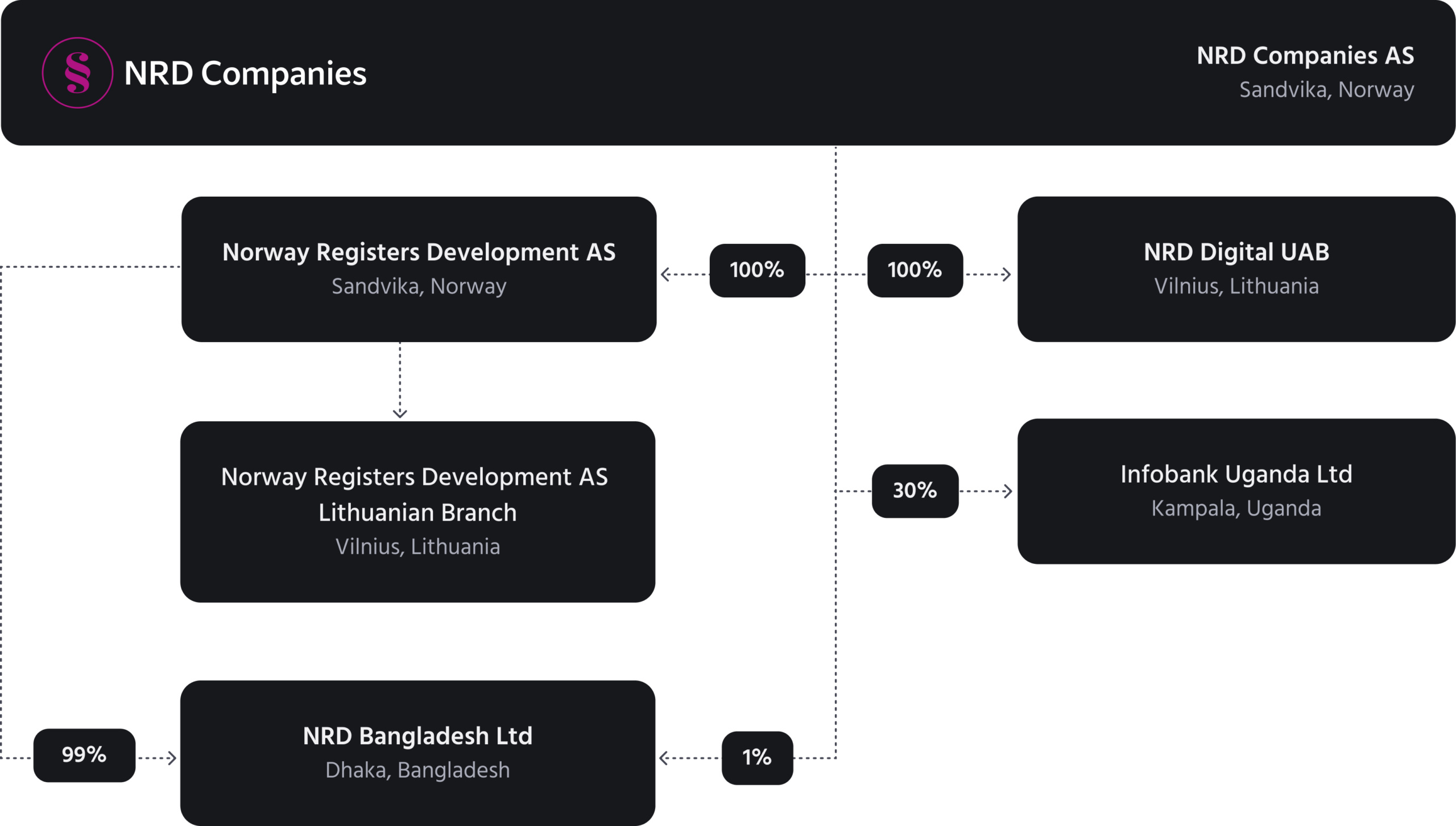 NRD Companies is a parent company for the following subsidiary corporations: Norway Registers Development AS, NRD Digital, Infobank Uganda and NRD Bangladesh Ltd.
